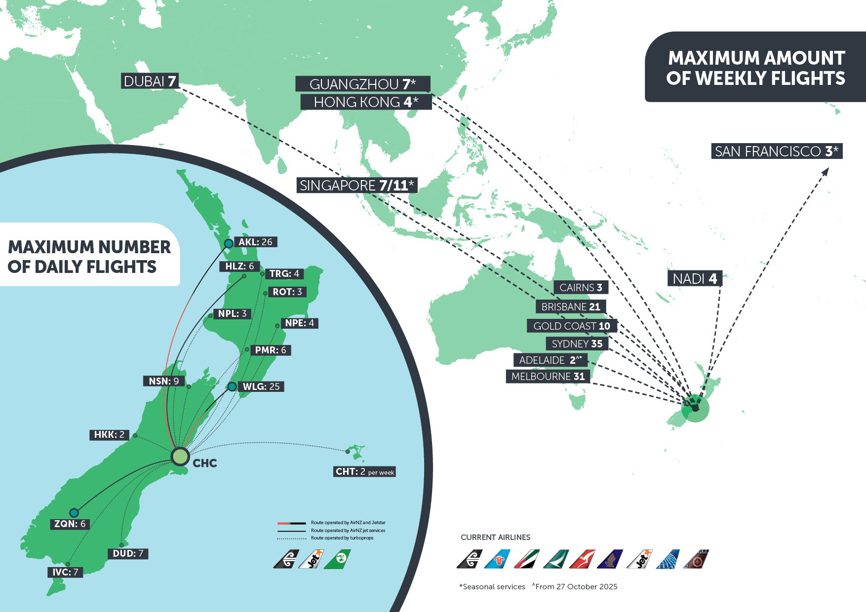 With regular services to 16 airports throughout New Zealand and more than 140 international arrivals and departures every week, we’re proud to connect travellers to their destinations at home and abroad.